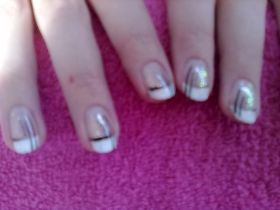Hier is met zilver en zwart een versiering aangebracht op shellac nagels. dit zijn dus geen kunstnagels