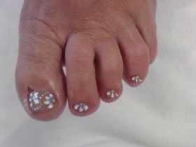 Dit is de voet met de schimmelnagel. Kijk bij het onderdeel pedicure-specialistische technieken voor meer informatie.